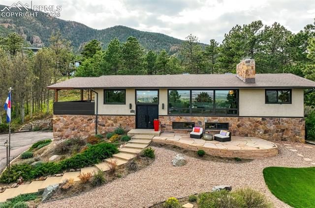 The timeless views. The sense of serenity. The wide open living. Enduring materials that express beauty today and tomorrow. Welcome to Broadmoor Heights. Blocks away from Strawberry Fields and Cheyenne Cañon Trails and treehouse-like views of the five-diamond/five-star gem The Broadmoor Hotel as well as a canvas of city lights, this mid-century modern home designed by acclaimed local architect Don Price has been lovingly restored. Moss Rock Fireplace. Beamed Living Room Ceilings. Matte-Finish Hardwood Flooring. Modern Quartz Kitchen with premium appliances (Induction GE Café, Bosch). Extensive cabinetry by Aspen Kitchens. Tongue & Groove Covered Deck. Marvin Windows and Doors. Exceptional Lighting. An ideal home office environment is bathed in natural sunlight. Primary suite with thoughtful built-ins and storage. A second fireplace in the basement. Walkout lower level. Custom Metal Double Entry Door, custom metal work on deck railings, and custom woodgrain-style steel plank garage doors, all amplify the beauty of the home's original design. Garage Shop (third bay sized). Newer (2020) composite shingle roof. Kohler sinks, custom window coverings in the living room and walkouts strategically placed around the residence invite the outdoors, in, to a harmonious, unhurried pace of life awaits. The abundance of thoughtful details continues outdoors in the low impact yard, where premium stone steps, synthetic turf in front and back, thoughtfully mitigated evergreens, a fenced-in backyard, front yard patio for views, an extensive circular asphalt driveway to the side of the residence, 2 additional gas lines on deck, and perennial raised beds all enjoy the charm of the Will Rogers' Shrine's Bells. Set in the hills above the Broadmoor Hotel, and within the prestigious Cheyenne Mountain District 12 school system, access to downtown is a short 15-minute drive through the canvas of one of Colorado's most cherished locations. Urban chic and mountain charm have converged at last.